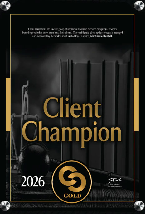 - Martindale Hubbell’s “Platinum Client Champion” award, 2021-2026 (recognizing attorneys for their commitment to the best in client service)